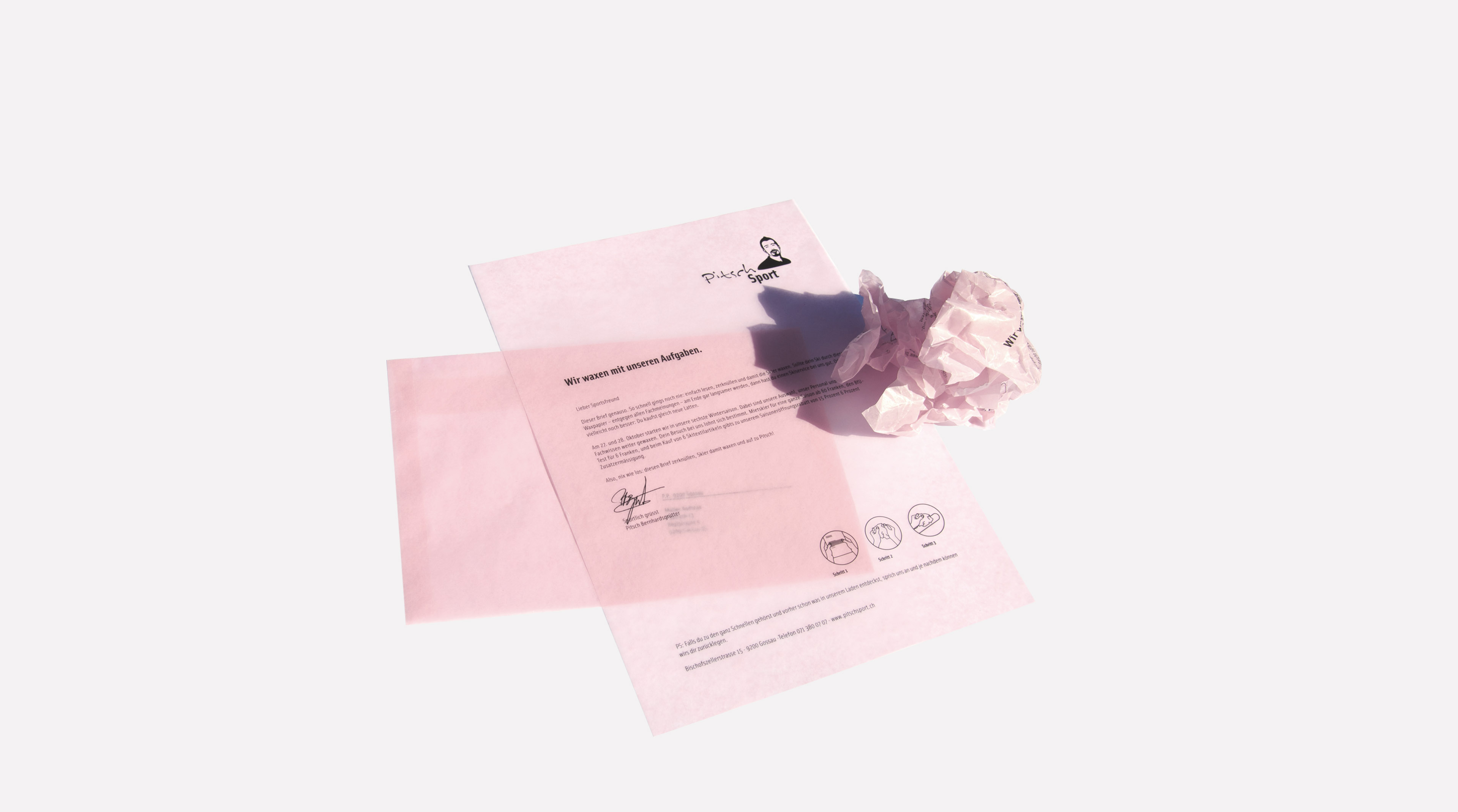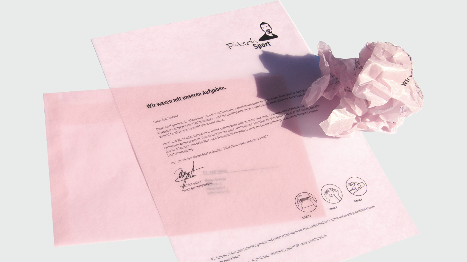 Christel Hedins kommentar: ”När ingen ville köpa vintersportsprylar på grund av regn, gjorde schweiziska Pitsch Sport en kampanj där deras DR var gjort av vaxat papper. Pappret kunde sedan knycklas ihop och användas till att vaxa skidorna. Om skidorna blev slöa så bjöd Pitsch på gratis service, vilket ökade kundflödet. Även här är idén större än kanalen! Det är så enkelt, därför blir det bra. Här finns ett större budskap inlindat, kampanjen hänger ihop och det är enkelt.”