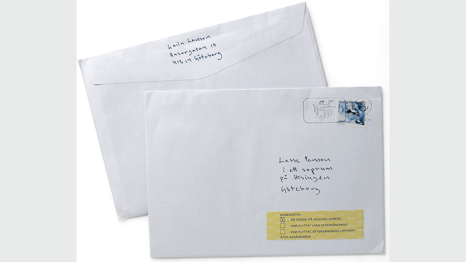 Christel Hedins kommentar: ”Räddningsmissionen i Göteborg gjorde utskick för en kampanj där de bad om bistånd. Det var brev där mottagaren till exempel var ’Lasse Persson i ett soprum på Hisingen’. Kuverten hade försetts med ’adressat okänd, tillbaka till avsändare’ som då var mottagarna av kampanjen. Här har vi återigen en idé som är större än ett utskick, och som verkligen visar på att många inte ens har adresser. De bor faktiskt under en bro, eller bakom en tunnelbanenedgång. Adressfältet belyser hela problemet.”