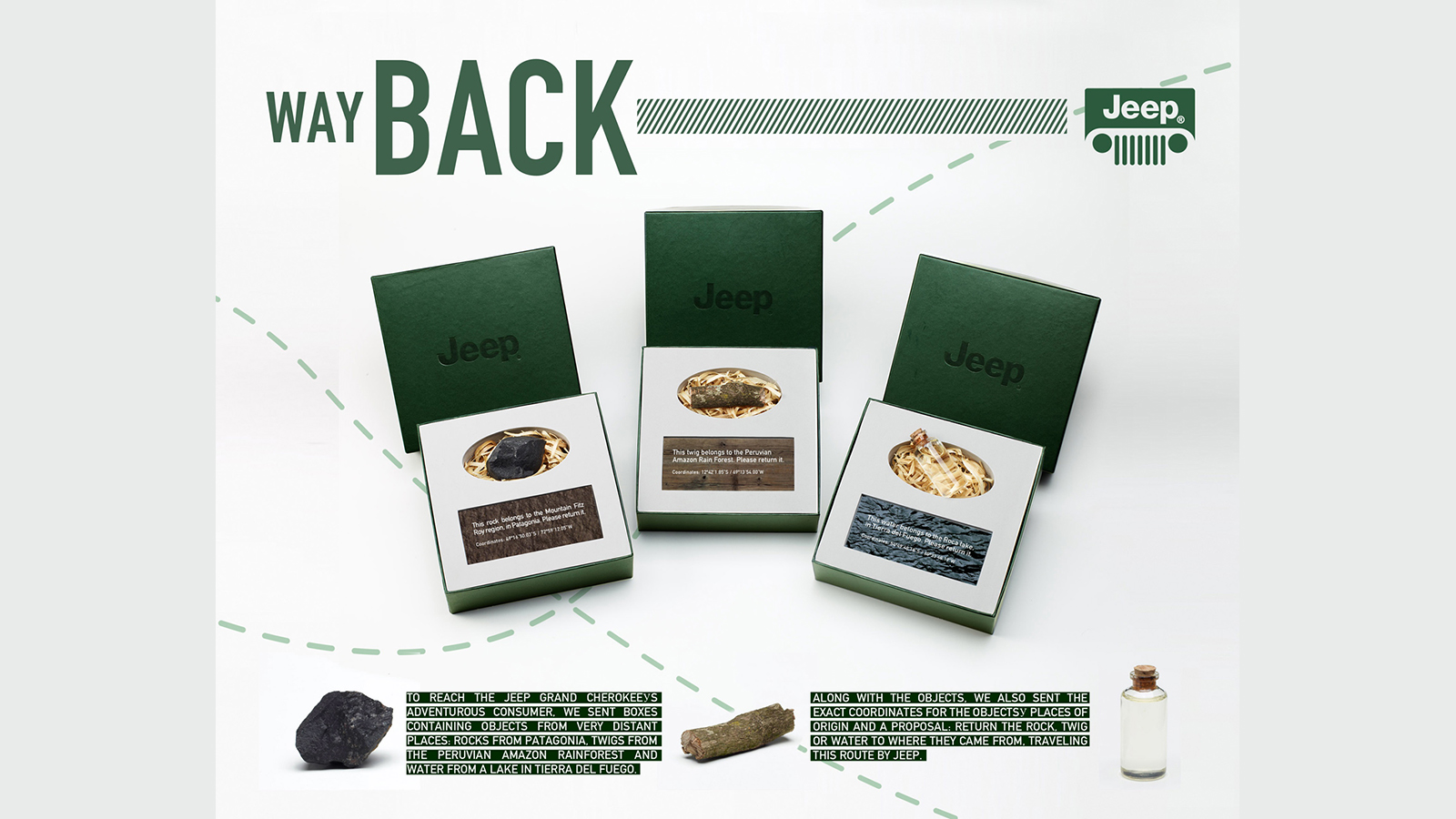 Christel Hedins kommentar: ”Jeep skulle lansera sin nya Grand Cherokee och gjorde det genom ett DR. Mottagarna fick grejer som en sten från Patagonien eller en kvist från Amazonas. De kom tillsammans med ett brev som föreslog att mottagarna skulle lämna tillbaka grejerna där de kom ifrån och åka dit i sin Grand Cherokee. Jeep skulle då betala hotell för de som nappade på detta. Det är klart att det finns massa möjligheter när det gäller att marknadsföra Jeep, jämfört med till exempel en bank. Men det här är klassisk DR när det är som bäst, med stenen till exempel. Idén är större än kanalen här, och ett problem med DR är annars ofta att man börjar i kanalen och låter den styra idén. Man ska alltid börja med idén och sedan ta ut det som DR.”