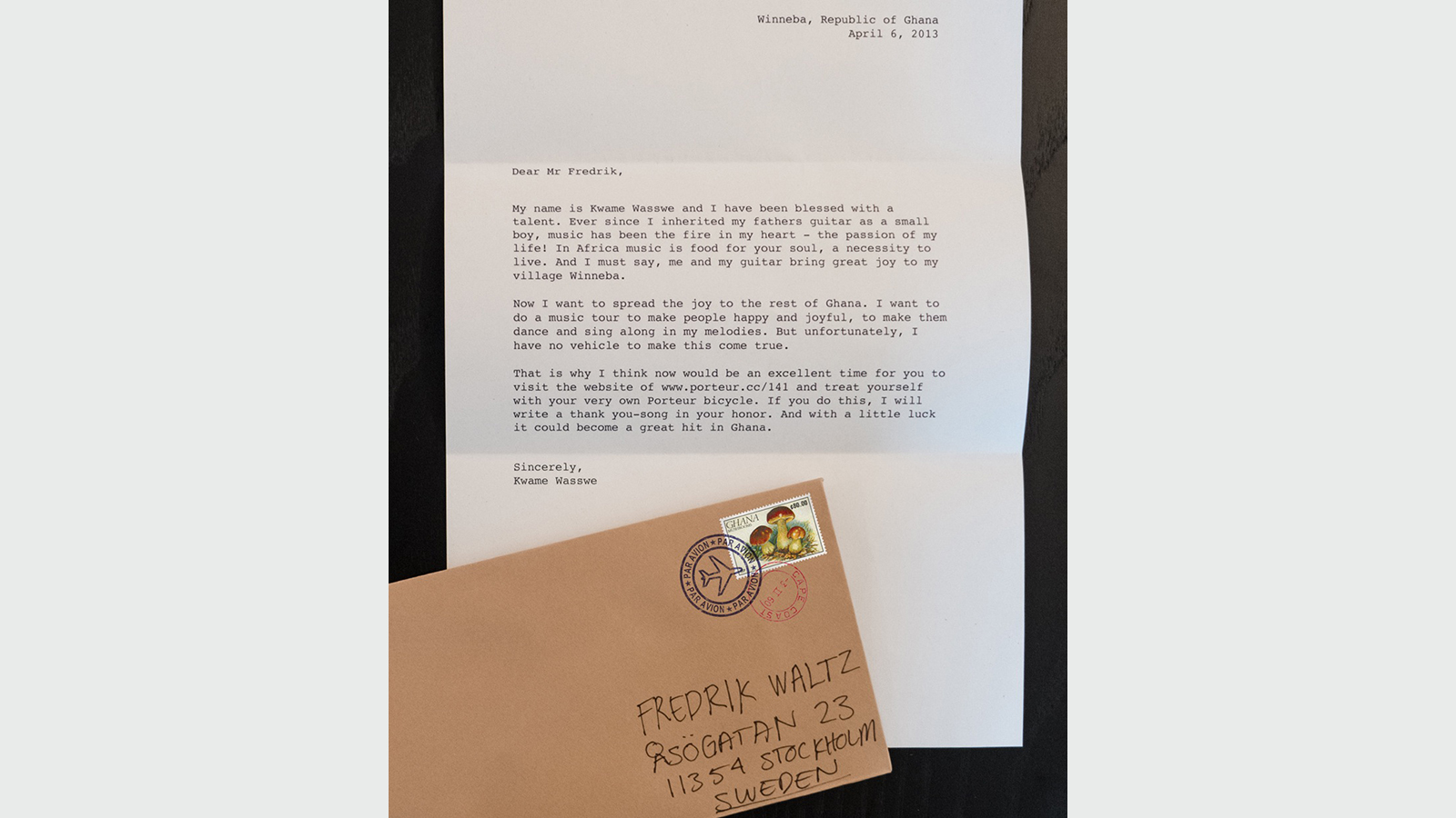 Christel Hedins kommentar: ”Här lät man afrikanska barn skriva personliga brev som skickades till utvalda svenskar, i en kampanj för cykelföretaget Porteur. Tillsammans med Unicef donerade de en cykel till ett behövande barn i Afrika för varje cykel som de sålde. Kampanjen gjordes i liten upplaga och var äkta och på riktigt, den hänger verkligen ihop. I dag kan man inte lura någon med reklam eller kommunikation, utan vi vill göra gott på riktigt. Kommunikationen måste vara demokratisk och får inte vara falsk.”