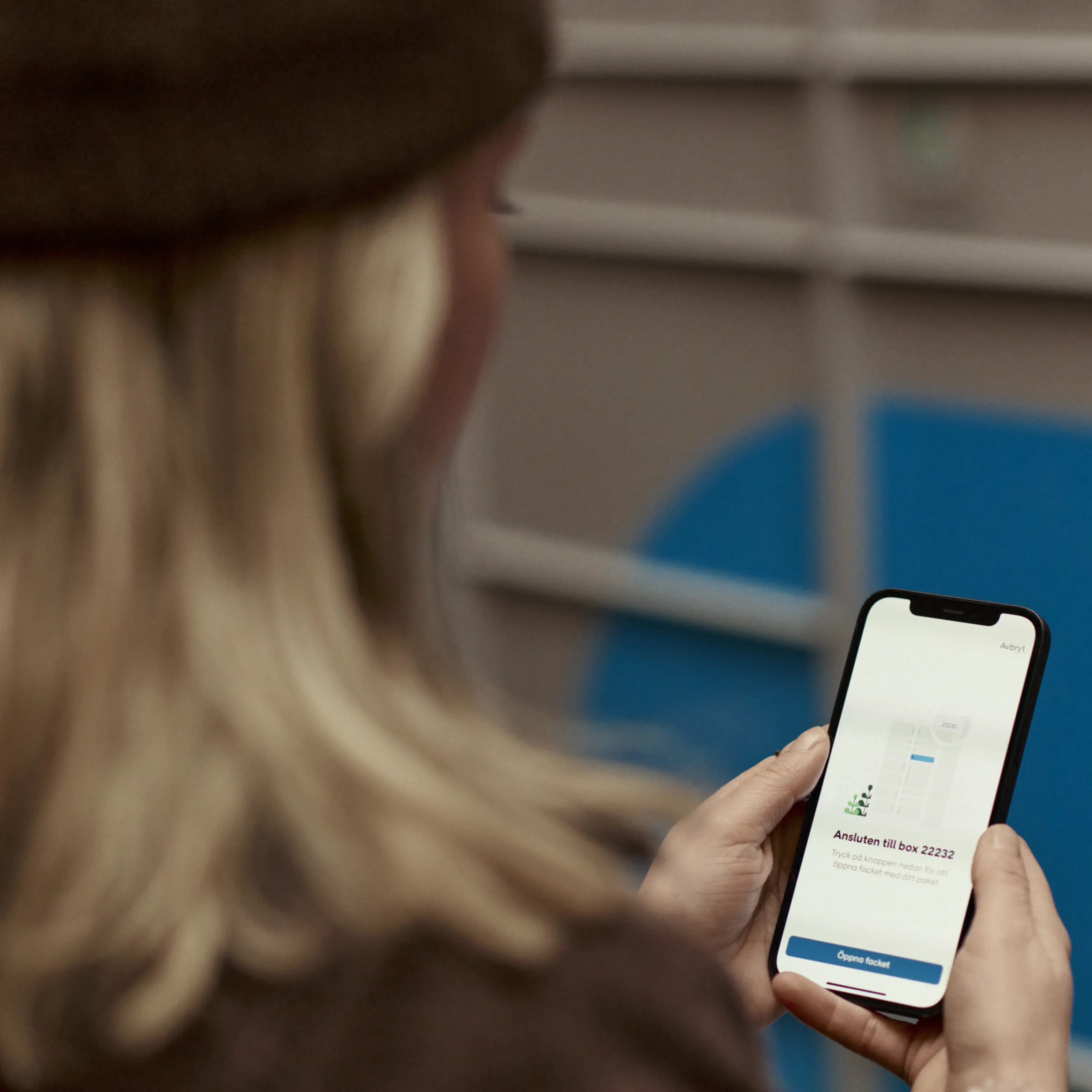 1. Öppna paketboxen med hjälp av PostNord App. På skärmen kan du se vilket fack som kommer att öppnas.